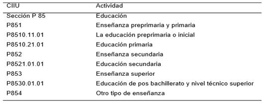 Al respecto, la actividad económica de la educación en el Ecuador, esta detallada en el CIIU P8510.21 Enseñanza, educación primaria; P8521.01 Enseñanza Secundaria, de formación general (Instituto Nacional de Estadistica y Censos, INEC, 2012). Dentro de estos grupos el impacto es diferente y se han analizado de forma global, considerando que el proceso de implementación tuvo sus particularidades; de hecho, la revisión de la literatura evidencia que existen pocos estudios que incluyen al sector de la educación, siendo necesario abordar esta temática considerando el impacto que dicho segmento tiene en lo social y económico. El CIIU consiste en la clasificación de las actividades, a continuación, en la figura 2 se presenta el sector de las entidades educativas del Ecuador.