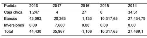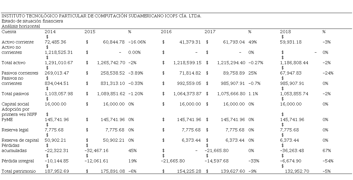 A continuación, se presenta la evaluación de los movimientos de los saldos de las cuentas más representativas de los estados financieros del Instituto Tecnológico Particular de Computación Sudamericano ICOPS Cía. Ltda., para el período 2014-2018, considerando que la empresa preparó los estados financieros de acuerdo con las NIIF a partir del año 2012 bajo el criterio de costo histórico.
