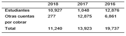 A partir del año 2016 la entidad clasifica sus cuentas en estudiantes y otras cuentas por cobrar, en el período 2014 la clasificación era la siguiente: