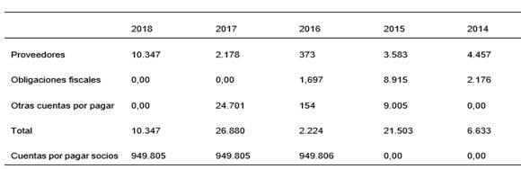 La figura 10 muestra que la empresa con respecto a las cuentas por pagar posterior al reconocimiento inicial las mide al costo amortizado aplicando el método de interés efectivo, al año 2014 el rubro fue de $ 4.457,09 representando el 0,40% del activo total, disminuyendo para el año 2015 en 19,61%, sin embargo, para el año 2016 el valor se incrementa en el 498,20% es decir pasa a $21.434,14 dólares, entendiéndose que la empresa requirió de financiamiento externo para la compra de bienes como: muebles, enseres y equipo didáctico, un punto importante de recalcar es que la institución tiene implementadas políticas de manejo de riesgos financieros, de manera que aseguran que todas las cuentas se liquiden de acuerdo a los términos crediticios establecidos, esto se refleja en el período 2017 por cuanto este rubro disminuye en 74,86% evidenciando la eficiencia de la gestión financiera para cumplir con las obligaciones contraídas durante los años anteriores.