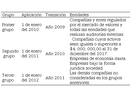 A la luz de este proceso de unificación, en el Ecuador a través de Resolución Nro. 06.Q.ICI.004 publicada en R.O. 348 del 4 de septiembre del año 2006, se normó adoptar las Normas Internacionales de Información Financiera NIIF y que sean de aplicación obligatoria por las organizaciones sujetas al control de la Superintendencia de Compañías, para la prelación de Estados Financieros (EEFF) a partir del año 2009. Así mismo, se estableció un cronograma para su aplicación en tres grupos desde el año 2010 al año 2012; en donde el tercer grupo lo constituyeron entidades no tomadas en cuenta en los dos grupos anteriores; es decir, las que a diciembre de año 2007 presentaron activos inferiores a $4,000,000.00 dólares, teniendo como fecha de transición el año 2011 y de aplicación a partir de enero del año 2012 (Superintendencia de Compañías, 2011).