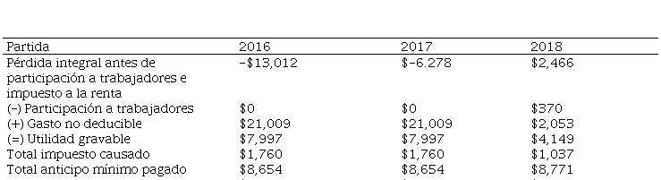 La tabla 2 muestra los resultados de la entidad en cuento al impuesto a la renta, calculado con base a la utilidad conforme las disposiciones legales, considera como impuesto mínimo a pagar el valor del anticipo calculado, que resulta de la suma del 0,4% del activo, 0,2% del patrimonio, 0,4% de los ingresos gravados y el 0,2% de los costos y gastos deducibles, para el período 2016 la empresa determinó un anticipo a la renta de $8,654, para el año 2017 de $8,654 y para el año 2018 de $8,771 el impuesto a la renta causado para el último período es de $1,037.