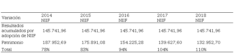 Según la información de la tabla 3, identificada en los estados financieros de la empresa, se aprecia que, dentro de las partidas adaptadas por la aplicación de la norma, se destaca la presencia de la cuenta resultados acumulados adopción de la NIIF por primera vez, debido a la revaluación de propiedad, planta y equipo e incremento en la depreciación acumulada, en consecuencia, durante los períodos 2014 - 2018 no se registró contablemente variaciones a la cuenta siendo su saldo al cierre del año 2018 de $145.741,96 dólares. Estos valores tienen un peso fuerte dentro del patrimonio de la empresa pues para finales del año 2018 representaron el 110% del patrimonio total. Resultados favorables para los socios de la entidad pues el adoptar la normativa internacional favoreció al incremento del patrimonio.