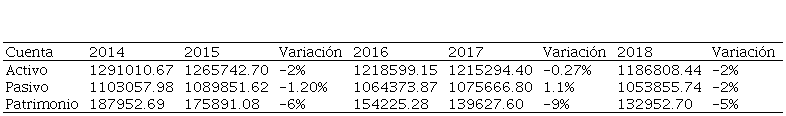Con respecto al pasivo durante el 2014 -2015 muestra una variación negativa del -1,20% por la reducción de las cuentas y documentos por pagar. Para el año 2017 la variación fue de 1,1% representado por los pasivos corrientes, sin embargo, al 2018 se evidencia una variación de -2% debido a las cuentas por pagar. El patrimonio se va afectado por las pérdidas generadas en los diferentes períodos.