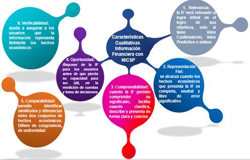 Estas características cualitativas tratadas en el marco conceptual de las NICSP, son relevancia, representación fiel, comprensibilidad, oportunidad, comparabilidad y verificabilidad, con sus particularidades, que a manera de resumen se presentan en la figura 7. Cada una de estas características cualitativas se complementan entre sí y ejercen acción conjunta para proporcionar información financiera que logre sus objetivos ( Federación Internacional de Contadores IFAC, 2018).