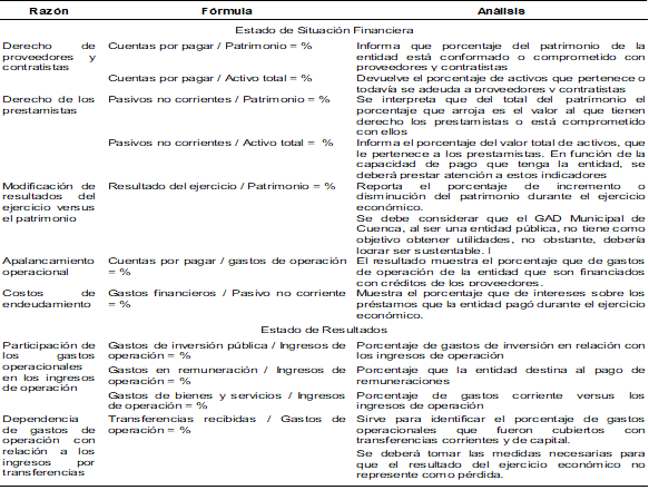 Componente 5. ? Diseño de esquemas que apoyen la gestión gubernamental en la toma de decisiones: una vez obtenida la información contable, visible a través de los diferentes estados financieros, la Coordinación Financiera estará en capacidad de analizar los resultados a través del método de razones financieras que permitirá tener los criterios y bases suficientes para la toma de decisiones que más convenga al GAD Municipal del Cantón Cuenca y que admitan la optimización de los recursos, así como el verificar el cumplimiento de las obligaciones contraídas para la consecución de los objetivos formulados, la tabla 2, plasma las razones financieras de mayor utilidad, su fórmula de aplicación y en resumen la interpretación que se dará a cada uno de los resultados.