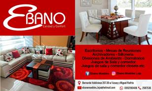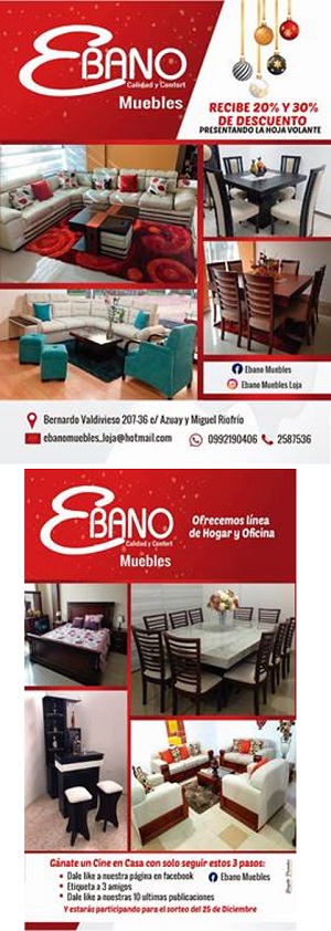 Ébano Muebles es una empresa fundada en el año 2014, la actividad comercial de esta es la elaboración y venta de muebles para hogar y oficina, cuenta con un taller de producción ubicado en el barrio el plateado además de un local de exhibición situado en las calles Bernardo Valdivieso 207-36 entre miguel Riofrio y Azuay. Cuenta con un equipo de trabajo integrado por 14 trabajadores, la línea de productos que ofrece son: juegos de salas, comedores, dormitorios, escritorios, closet, sillonería y demás complementos del hogar.