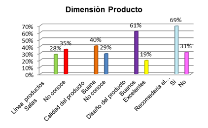 La dimensión producto está integrada por 4 preguntas, estas muestran la opinión que las personas tienen acerca de la línea de productos que ofrece la empresa, la calidad del bien terminado, los atributos en el diseño de los muebles y posibilidad de recomendar el producto a otras personas.