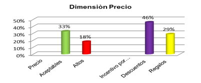 Las interrogantes relacionadas con la dimensión precio muestran que el 33% de la población de estudio consideran que los precios de los muebles son aceptables en comparación a la competencia mientras que el 18% opinan que los precios son altos. Por otro lado, el 46% de los clientes manifiestan en sus respuestas que el mejor incentivo por la compra son los descuentos mientras que un 29% desean que la empresa les incentive con regalos.