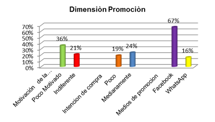 La información de la dimensión promoción demuestra que el 36% de los clientes se ven poco motivados con la publicidad que maneja la organización mientras que un 21% considera que la publicidad es indiferente. Asimismo un 24 % de ellos considera que tiene intención de compra al ver los anuncios de la empresa mientras un 19% opina que la intención de compra es poca. Finalmente 67% de los encuestados desean recibir publicidad de la empresa en Facebook y un 16% en WhatsApp.
