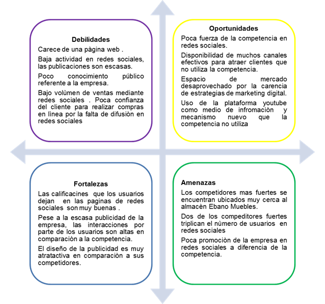 En este tipo de análisis se establece las principales debilidades, amenazas, fortalezas y oportunidades de Ébano Muebles para determinar aspectos importantes que la empresa puede aprovechar para mejorar la competitividad y así establecer las estrategias de Marketing Digital que aumenten la cuota de mercado, este análisis se presenta a continuación en la siguiente figura.