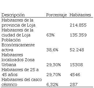 Dado que el universo es bastante amplio, se considerò como poblacòn de estudio a los habitantes de la ciudad de loja comprendidos en edades de 25 a 45 años que formen parte de la poblaciòn econòmicamente activa y que vivan en el casco cèntrico de la ciudad, tomando datos del Instituto Ecuatoriano de Estadìsticas y Censos (INEC) se lo presenta en siguiente cuadro: