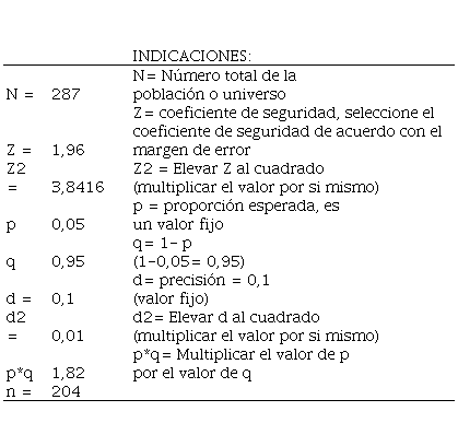 Con una muestra de 287 habitantes y aplicando la formula de la poblacion finita el nùmero de encuestados es 204, el calculo de este nùmero se presenta en la siquiente tabla.