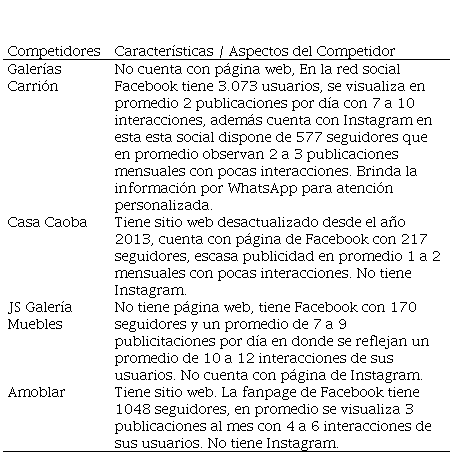 El análisis de los competidores se basa en establecer aspectos puntuales como: cuentas de redes sociales que disponen para lanzar la publicidad en los medios virtuales, número de interacciones por parte de sus seguidores y cantidad de publicaciones que realizan periódicamente, estos aspectos se visualizan en la siguiente tabla.
