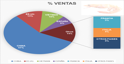 Por ello se reitera que, en Ecuador la acuacultura se destaca como un sector importante y de alto desarrollo para la economía, teniendo al camarón como su producto de principal exportación en un promedio de 50 años aproximadamente; por tanto, la atención que requiere este sector se despliega en plantear propuestas encaminadas al desarrollo estratégico de competitividad en el mercado internacional. Alvarado (2020) en su artículo publicado en diario El Comercio manifiesta que durante el año 2019, el sector camaronero alcanzó su máximo en producción considerando desde sus inicios (50 años) con nivel de exportación de 1291.5 millones en libras, incrementándose en un promedio del 27% frente al año 2018 acorde a reporte generado por la Cámara Nacional de Acuacultura (CAN), lo que significó un aumento considerable según evaluación de la CNA, teniendo como mercado principal China con un total del 57% en ventas, Estados Unidos con 13%, Vietnam con el 10%, España en un 6%, Francia 5%, Italia 4% y un mínimo del 5% del mercado para otros países.
