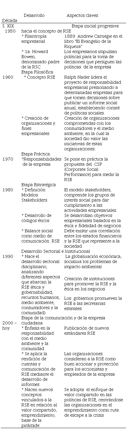 Así mismo, ( Cueto-Cedillo & De-la-Cuesta-González, 2019), refieren que la responsabilidad social se origina en el quehacer empresarial con diferentes aproximaciones de pensamiento económico, político social o filosófico, por lo que es indispensable el análisis de su origen en la década de los 30 y en los 50 del siglo XX aceptar que la responsabilidad social corporativa ha evolucionado a mayor escala y paralelamente a la globalización económica del país, conciencia ecológica y en tecnología, en la cual expone el proceso de evolución de la RS, evidenciando diferentes etapas en las que se exponen los aspectos claves que identifican su desarrollo hasta la actualidad.