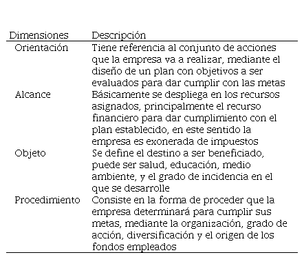 Cabe destacar que, existen dimensiones estratégicas que abarcan la RS en el sentido de cumplimiento que las empresas deben crear como planificación estratégica, considerando como punto de partida las metas-objetivos de los directivos empresariales en relación a los recursos destinados para fines sociales en base a las preguntas claves tales como: ¿Qué logros va a obtener?, ¿cómo lo realizará?, ¿Qué libertad dispone la gerencia para hacerlo?, ¿De qué forma se evaluará?; para que ello exista, en la dirección empresarial se presentan dos escenarios de correspondencia el primero se da cuando el directivo principal gerencia la RS en la empresa y el segundo cuando el directivo principal propone la gerencia de RS; acorde a lo planteado, se mencionan cuatro dimensiones: Orientación, alcance, objeto y procedimiento ( Villasmil-Molero & Prieto-Pulido, 2013).