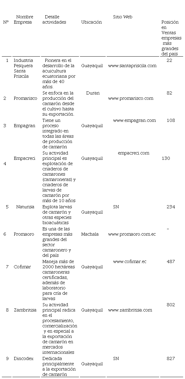 Por ello, es importante acentuar que el sector camaronero es una considerado importante en la industria del camarón, lo que destaca el trabajo en equipo realizado por la CNA, los empresarios y personas que forman parte de ello incluidos los países de destino a exportar. La revista (Clúster Camarón EM, 2017), resalta que las grandes empresas camaroneras en el Ecuador son exportadoras y se concentran en Guayaquil o sus alrededores, abarcando la totalidad de su producción hacia una comercialización estable que les permite posesionarse entre las principales del país.