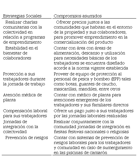 Durante el proceso de análisis de responsabilidad social que tienen las empresas camaroneras de la provincia de El Oro, se determina que no todas cumplen con los requisitos establecidos para el efecto, por lo general la mayoría de ellas cumplen esporádicamente con los requisitos que establecen las diferentes normativas internacionales, siendo la mayoría de las empresas que trabajan bajo un marco específico durante el proceso de producción del camarón. Así mismo, cumplen a nivel medio con sus obligaciones laborales y la ética que les permite trabajar bajo un nivel de responsabilidad social en referencia a la protección de sus empleados, el ecosistema y la comunidad.