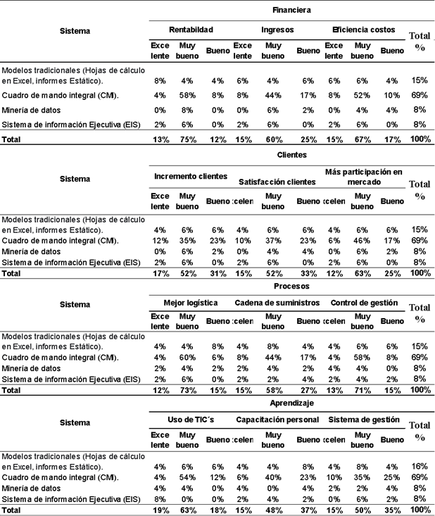 Las comercializadoras tienen un factor común que es la obtención de rentabilidad para los accionistas, el dinero es su prioridad, por lo tanto, para llegar a este punto se necesita conocer el nivel de ingresos y costos que permiten generar los SI que manejan las pymes. El 69% utiliza el CMI, el 15% el modelo tradicional que sirve para el control contable, el 8% Minería de Datos, el 8% el Sistema de información Ejecutiva (EIS).