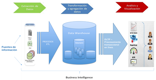 Los sistemas (BI) organizan la compilación de datos, el almacenamiento de dicha información y la gestión del conocimiento con instrumentos analíticos para entender y dilucidar información compleja que permita procesar y obtener resultados de forma eficiente a fin de que la secuencia de las actividades empresariales continúe su curso habitual. Los principales componentes que se encuentran en estos sistemas están las fuentes de información, ETL (extracción transformación), minería de datos, aplicaciones analíticas, bandeja de datos, Data Warehouse que a su vez contiene subcomponentes.
