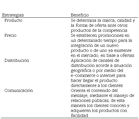 Prosiguiendo lo expuesto, ( González, 2018) califica a las estrategias de comercialización como un factor clave que persigue el marketing para promocionar un producto al mercado o incrementar el promedio de ventas en una empresa; además, están orientadas a satisfacer el deseo o necesidad de los consumidores y clientes. Otro beneficio que se obtiene en la aplicación de estrategias de comercialización, es el análisis de su estado comercial ante la competencia, entre las principales se mencionan cuatro que son indispensables tales como estrategias de producto, estrategias de precio, estrategias de canales de distribución y finalmente estrategias de comunicación, ver tabla 4.