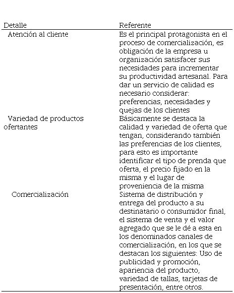 Es también relevante mencionar que existen canales de comercialización a corto plazo; que generalmente, son circuitos cortos porque se disminuye totalmente el número de intermediarios a uno solo lo que equivale una cadena comercial mínima. Básicamente, los canales de comercialización a corto plazo ofertan beneficios a sus involucrados, en la cual se destacan el poder ne negociación, segmentación de mercado y la reducción de competencia con productos importados en la cual el consumidor adquiere productos de óptima calidad a menor costo, estableciéndose directamente un enlace comercial entre productor y consumidor, creandodeesta manera un ambiente estable en el sector productivo ( Rodríguez-Guerra, Sánz-Caneda & García-Azcárate, 2017). En la comercialización de tipo artesanal, ( Rodríguez, Paz-Calderón, Reyes-García & Espinoza-Espíndola, 2018), indican que ésta se desarrolla en las diferentes líneas de ropa e indumentaria, basada en sus carácterísticas de diseño con una combinación exclusiva entre lo cultural y lo moderno; sin embargo, para que estos productos tengan el éxito deseado, es necesario que los artesanos apliquen estrategias que permitan ofertar sus productos con visión futurista fundamentada con un excelente atención al cliente, publicidad idónea, capacitación en ventas, ampliación de sus negocios, entre otras. Entre tanto, enfocan tres aspectos centrales de comercialización de sus productos tales como: la atención al cliente, variedad de productos ofertantes y finalmente su comercialización.