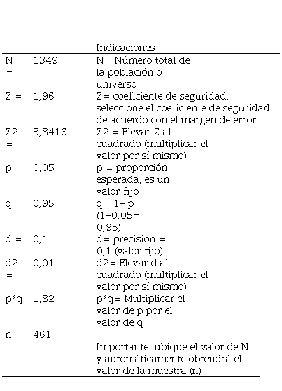En consideración a la población objeto de estudio, fue finito es decir 1349 personas de sexo femenino, comprendidas en una edad de 30 a 35 años; una vez que se aplicó la fórmula muestral, los resultados indicaron el tamaño de la muestra que fue de 461 mujeres pertenecientes al cantón Gualaceo, provincia del Azuay, ver tabla 6.