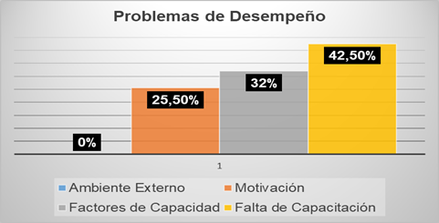 Para la asociación la posible causa del desempeño se puede dar por una falta de capacitación al personal ya que el 42.5% lo califica a esta variable como un problema, el 32% la califica como factores de capacidad y el 25.5% como falta de motivación, es decir la falta de capacitación puede generar variables de inconformidad, y se ve reflejadas en la duda de capacidad del personal y la falta de motivación. (Véase Figura 4)