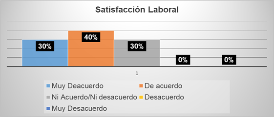 Al consultar sobre la satisfacción del puesto laboral el 30% se siente muy desacuerdo con su puesto el 40% de acuerdo en su cargo y el 30% Ni de acurdo/ni desacuerdo, en otro sentido se debe suponer que el 30% que no está ni de acuerdo/ ni desacuerdo tiene falta de motivación o no son considerados dentro de las capacitaciones para mejorar su ambiente laboral. (Véase Figura 5)