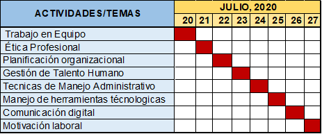 Establece el periodo de tiempo en el cual se desarrollará la capacitación al personal de la asociación tanto a socios como a trabajadores, comprendidos en ocho actividades que se desarrollaran del 20 al 27 de julio del 2020.