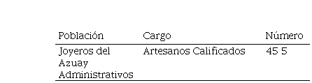 El universo de estudio de la siguiente investigación se caracteriza por ser finito probabilístico y homogéneo, integrado por 45 socios y 5 Administrativos que pertenecen a este gremio según la base de datos de la Asociación de Joyeros de Azuay. Por lo tanto, se aplicará al 100% del universo.