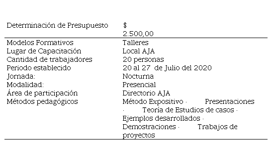 La incorporación del plan en el área administrativa de una entidad responde a la formación del personal dentro de un período establecido, considera que se encuentre delimitada dentro de las estrategias institucionales y debe establecer parámetros de la población a la cual se la va a dirigir, las metodologías pedagógicas, la estimación económica, las soluciones deseadas y la valoración de la obtención del aprendizaje con los resultados esperados tras su adaptación en el área laboral.