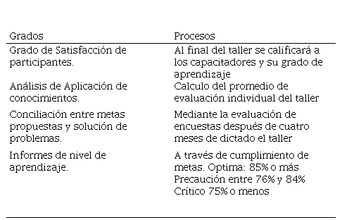 Entre los indicadores que permitirán determinar si las labores fueron exitosas son: las entrevistas a los colaboradores para conocer su grado de satisfacción, las evaluaciones implementadas por el dotador de los servicios formativos, el análisis de la aplicación de los conocimientos por parte del profesional en su puesto de labor, los informes sobre nivel de aprendizaje y los estudios sobre el retorno de la inversión ( González-Verde & Muñiz-Izquierdo, 2016).