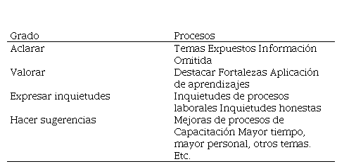 En este paso se mide los objetivos alcanzados en la capacitación, es decir identificar las acciones que se implementó para mejorar el desempeño laboral, cuyo propósito sea el progreso continuo y el beneficio de la capacitación dentro de la asociación. La retroalimentación dentro de la organización debe generarse de manera oportuna, incluyendo aclaraciones de temas expuestos, valorando objetivos alcanzados, expresando inquietudes de procedimientos, y haciendo sugerencias para la mejora de próximas capacitaciones.