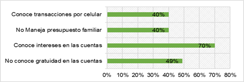 Dentro de los encuestados, se observa que existen desconocimientos en algunos conceptos financieros. El 49% desconoce que no existen costos por apertura y manejo de las cuentas de ahorro. El 40% de la población encuestada no maneja un presupuesto de ingresos versus gastos, así mismo existe el 40% de los encuestados desconoce que existe la transaccionalidad mediante móvil o celular. En cambio, el 70% de los encuestados si conoce que al abrir una cuenta de ahorro le cancelan un valor por intereses, aunque no termina convenciendo que lo haga.