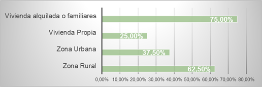 Los resultados presentados en la figura 2, demuestran que el 75% de la población que no accede al sistema financiero no tiene vivienda propia, sino que arrienda o vive en la residencia de familiares, en comparación del restante 25% de encuestados. Se observa además que la mayor parte de los encuestados reside en el área rural con el 62,50% en comparación con el 37,50% en el área urbana.