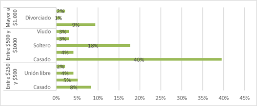 El estado civil de los encuestados se concentra en mayor parte en casado y soltero en 57% y 23% respectivamente. El ingreso familiar se encuentra en mayor fracción dentro del rango entre quinientos y mil dólares con un 68%.