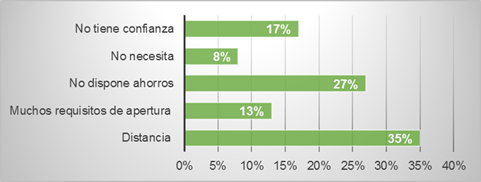 Como uno de los factores más importantes para que las personas no utilicen servicios financieros, es la distancia entre sus domicilios y la institución financiera con un 35%, seguido con un 27% que no dispone de ahorros. El 17% de los encuestados dice no necesitar servicios financieros, el 13% menciona que los requisitos de manejo de las cuentas como el principal obstáculo para no utilizar servicios financieros y el 8% mencionó la desconfianza en las instituciones financieras.