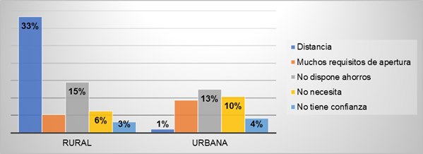 En la figura 5 se compara los obstáculos de la inclusión financiera entre la población encuestada del área rural contra la urbana del cantón Santa Isabel, en donde se presenta que para el área rural la principal causa para no mantener una cuenta de ahorros es la distancia entre su domicilio y la entidad financiera, seguida de la no disponibilidad de dinero para el ahorro. En cambio, en el sector urbano la principal causa es la no disponibilidad de ahorros, seguido de la no necesidad de utilizar los servicios financieros.