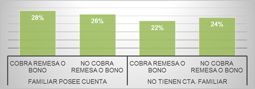 Como se presenta en la figura anterior, el 54% de los encuestados manifiesta que dentro de su hogar un familiar posee una cuenta de ahorro, que puede ser una razón para la no apertura de una cuenta. Así como también se observa que el 50% de los encuestados visita algún tipo de institución que puede ser financiera para cobros de bonos o remesas, este acercamiento es una oportunidad para las instituciones para atraer a potenciales clientes para la oferta de productos de ahorros en donde se vean acreditados los valores a cobrar.
