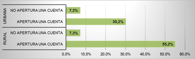 En la figura anterior muestra que las personas encuestadas cuyo determinante para no abrir una cuenta es la distancia del domicilio hasta las entidades financieras, el 86,4% contestó que abriría una cuenta si es que existiría un corresponsal, banco del barrio u cajero automático cerca de su domicilio. La tendencia es mayor en el área rural en comparación con la urbana.