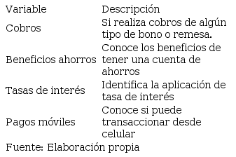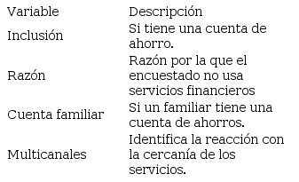 Igualmente se definen variables para determinar el uso de servicios financieros del encuestado y su entorno familiar, además de variables para establecer el nivel de educación financiera que tienen los habitantes del cantón Santa Isabel, las que se presentan en las siguientes tablas: