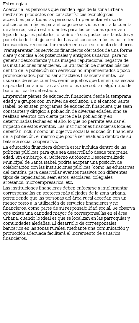 Con los resultados obtenidos en la presente investigación, se han determinado las razones o causas por que la población del cantón Santa Isabel, no acceden a servicios dentro del sistema financiero nacional. Tomando en cuenta los conceptos expuestos, se formulan las siguientes estrategias, para que sean acogidas por las instituciones financieras que tienen influencia en el cantón.