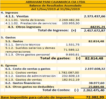 La empresa registra las distintas transacciones diarias en base a las NIIF; al concluir el período fiscal que va desde el 1 de enero al 31 de diciembre de cada año, se obtiene la base para el cálculo del impuesto a la renta de la siguiente manera:
