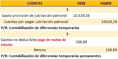 Como se puede observar en la figura 9, el asiento contable 1 registra las diferencias temporarias que afectan a las cuentas del gasto y del pasivo, generándose impuestos diferidos al reversar la cuenta del pasivo en ejercicios económicos posteriores hasta que se liquide. Mientras que las diferencias temporarias permanentes como se puede apreciar en el asiento 2 afecta al gasto y al activo circulante y no tienen incidencia en períodos contables posteriores.
