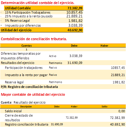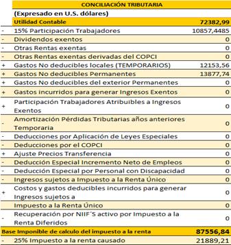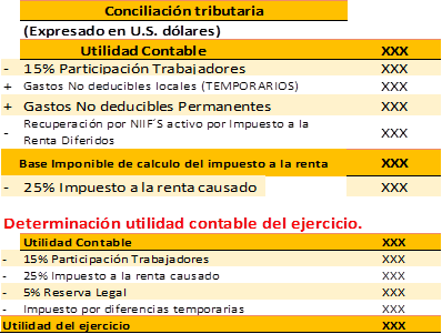 Al concluir el ejercicio económico la empresa obtiene la utilidad contable, a partir de esta base imponible se realiza los ajustes extracontables mediante la aplicación de la NIC 12 y la sección 29 de la NIIF para PYMES, de esta manera se eliminan las diferencias entre la base contable y la base fiscal. Los ajustes extracontables únicamente se registrarán cuando existan diferencias temporarias deducibles, éstas afectan, tanto a los activos o pasivos diferidos, como a la conciliación tributaria.