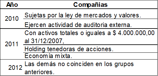En el Ecuador, en agosto del año 2006 mediante resolución emitida por la SUPERCIAS., se establece la adopción de las NIIF con carácter obligatorio y se fija un cronograma de aplicación en tres grupos divididos por tipología de empresa que inician en el año 2010, hasta 2012, como se puede observar en la figura 1 (Campoverde-León, & Castro-Garcés, 2016).