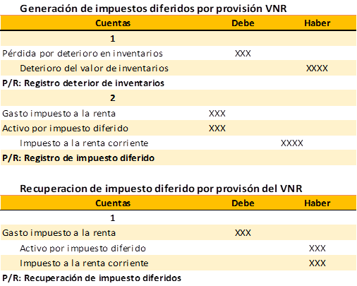 Contablemente el VNR se registra en el ejercicio económico corriente como deterioro en el inventario, mientras que, la norma tributaria indica, que esta provisión se reconoce como gasto no deducible generando impuestos diferidos y se recuperará al momento de la enajenación o consumo. Por lo tanto, se dejará plasmado los respectivos asientos contables que la empresa puede utilizar cuando realice la provisión por el VNR a los inventarios (figura 17).