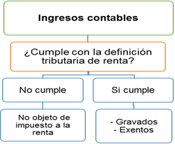 En este contexto, resulta imperioso entender cuál es la diferencia entre la normativa contable que se basa en NIC 12, NIIF para PYMES sección 29 y la normativa tributaria sustentada en la LORTI y sus reglamentos. El impuesto a las ganancias está relacionado con los lucros o pérdidas que se obtienen en el ejercicio fiscal. Tanto ganancias como pérdidas están sujetas a la tasa impositiva reglamentada en la normativa tributaria o impuesto a la renta. Esta grava todos los ingresos obtenidos, ya sea en el país o en el exterior, por las personas naturales y jurídicas establecidas en el Ecuador, tanto por las actividades económicas que desempeñen como por los ingresos que hayan obtenido a título gratuito u oneroso. La LORTI establece los ingresos gravados y exentos (ver figura 2) para la liquidación de este impuesto, dado que, los ingresos gravados son la base para el cálculo del impuesto a la renta.
